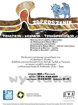 Biuro Wystaw Artystycznych w Tarnowie zaprasza na wystawę prac studentów II i III roku Zakładu Wzornictwa Instytutu Sztuki PWSZ w Tarnowie. „Tradycja Kreacja Transformacja” to finał projektu naukowego, w ramach którego odbył się cykl warsztatów z zakresu tradycyjnych technik rękodzielniczych. Były to warsztaty batiku prowadzone przez Aleksandrę Herisz z Bytomia, warsztaty wikliny prowadzone przez mistrza wikliniarstwa Grzegorza Gordata z Modlina i warsztaty papieru czerpanego prowadzone przeze Aleksandrę Zubę-Benn.