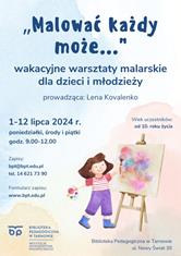 Od pierwszych dni lipca, Biblioteka Pedagogiczna w Tarnowie zaprasza dzieci powyżej 10 roku życia na Wakacyjne Warsztaty Malarskie „Malować każdy może”. Poprowadzi je ukraińska artystka, absolwentka Akademii Sztuk Pięknych w Krakowie, Lena Kovalenko. Zajęcia odbywać będą się w plenerze oraz w siedzibie biblioteki przy ulicy Nowy Świat 30, w dniach 1, 3, 5, 8, 10 i 12 lipca w godzinach 9.00 – 12.00. Warsztaty będą doskonałą okazją do nauczenia się podstaw malarstwa, rozwinięcia swoich umiejętności artystycznych oraz poznania nowych przyjaciół o podobnych zainteresowaniach. – Nie przegap tej niezwykłej szansy na rozwój kreatywności w przyjaznej atmosferze! – zachęcają organizatorzy.