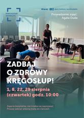 Zajęcia poprowadzi Agata Duda, trenerka personalna, przygotowania motorycznego, fitness, pilates, zdrowego kręgosłupa, jak również kilku dyscyplin sportowych. Cykl ćwiczeń zaplanowano 1, 8, 22 i 29 sierpnia, wszystkie rozpoczynać się będą o godzinie 10.00.Nie ma zapisów, udział bezpłatny.