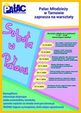 Sobota w Pałacu to propozycja Pałacu Młodzieży w Tarnowie na jesienno-zimowe soboty. 11.00 - 13.00. Spotkania, które odbywać się będą w wybrane soboty w godzinach 11.00 - 13.00, będą obejmować warsztaty z zakresu rzemiosła, majsterkowania, upcyklingu, szycia, rękodzieła i sztuk plastycznych. Planowane są też warsztaty taneczne, muzyczne i sportowe. Część warsztatów przyjmie formułę działań rodzinnych - dzieci z rodzicami, dziadkami lub starszym rodzeństwem. Uczestnicy będą pracować pod okiem wyspecjalizowanej kadry. Wśród sobotnich propozycji znajdzie się także wymiana niepotrzebnych już w domu rzeczy. Warsztaty są bezpłatne, liczba miejsc ograniczona.
