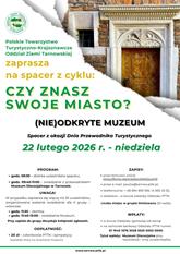 Z okazji przypadającego 21 lutego Dnia Przewodnika Turystycznego, Oddział PTTK „Ziemi Tarnowskiej” zaprasza w niedzielę, 22 lutego na kolejny spacer z cyklu „Tarnów – czy znasz swoje miasto?”. Spacer przebiegał będzie pod tytułem „(Nie)odkryte Muzeum”, a tym muzeum będzie Muzeum Diecezjalne. Zwiedzania zaplanowano w dwóch turach. Pierwsza rozpocznie się o godzinie 9.30 (dostępne są tylko zapisy na listę rezerwową), początek drugiej zaplanowano na godzinę 11.30. Liczba miejsc jest limitowana i wynosi 25 osób na turę. Przewodnikiem będzie jak zwykle Kacper Szymański. Odpłatność wynosi 20 złotych (cena zawiera kwotę na utrzymanie muzeum).