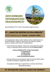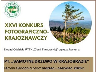 Oddział PTTK „Ziemia Tarnowska” zaprasza do udziału w XXVI Konkursie Fotograficzno-Krajoznawczym „Samotne drzewo w krajobrazie”. Konkurs skierowany jest do uczniów szkół ponadpodstawowych i ponadpodstawowych, a także do uczestników indywidualnych. Tematyka zdjęć jest oczywista, przy czym prace muszą być wykonane na terenie Beskidów i Pogórzy, w granicach kraju. Czarno-białe lub kolorowe zdjęcia muszą być wykonane samodzielnie i nigdzie wcześniej nie publikowane, konieczne jest opis lokalizacji. Każdy z uczestników może zgłosić do konkursu tylko jedną fotografię. Prace przyjmowane będą do soboty, 6 czerwca. Szczegółowy regulamin konkursu dostępny jest na stronie www.tarnow.pttk.pl/aktualnosci.